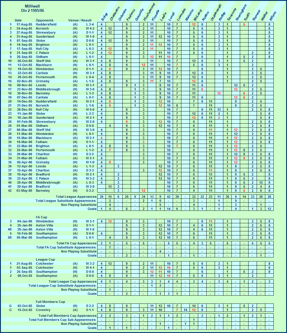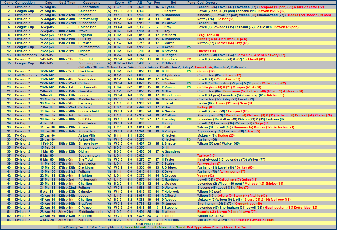 Excel Spreadsheet Version of Statistics: Season 1985/86