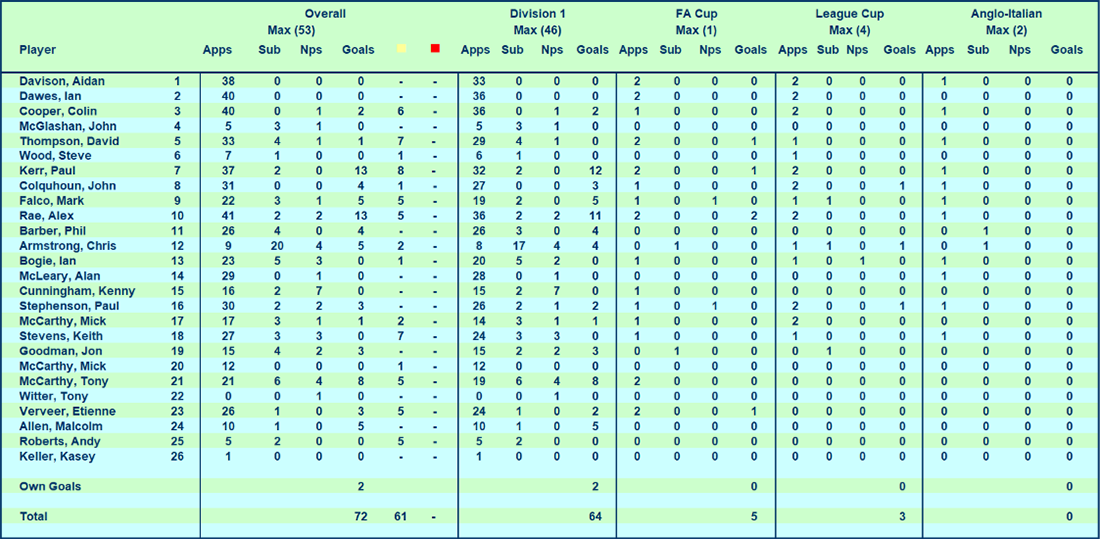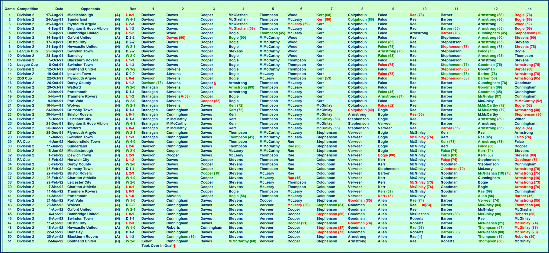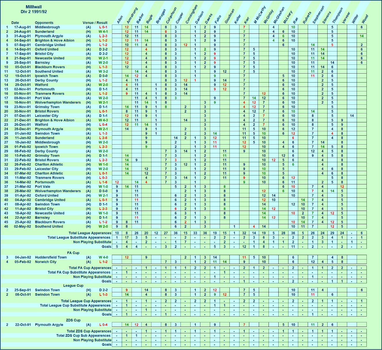 Excel Spreadsheet Version of Statistics: Season 1991/92
