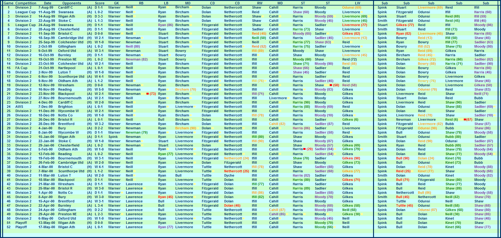 Excel Spreadsheet Version of Statistics: Season 1999/00