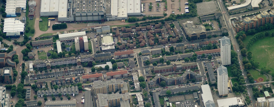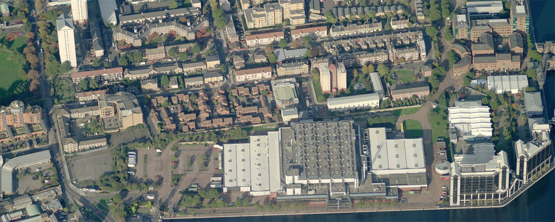 Glengall Road, behind the small row of houses and shops on West Ferry